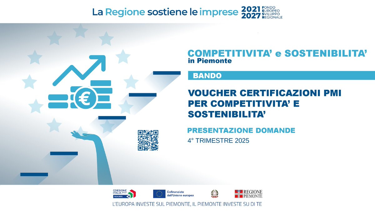 La misura “Voucher certificazioni PMI per competitività e sostenibilità“, approvata dalla Giunta regionale del Piemonte, sostiene le PMI che intendono ottenere certificazioni volontarie in ambito tecnologico, ambientale e di innovazione sostenibile. Fa parte dell’azione “Supporto alla competitività e alla transizione sostenibile del sistema produttivo regionale” del FESR 2021-2027.