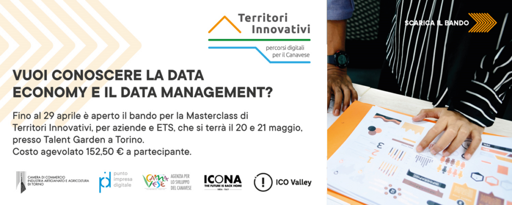 Nell’ambito del progetto Territori Innovativi, Agenzia per lo Sviluppo del Canavese, grazie al supporto della Camera di commercio di Torino, e in partenariato con ICONA e ICO Valley, vi invita a partecipare al bando per accedere alla Masterclass in Data Management che si svolgerà venerdì 20 maggio (8 ore) e sabato 21 maggio (4 ore) presso Talent Garden a Torino, via Giacosa 38.