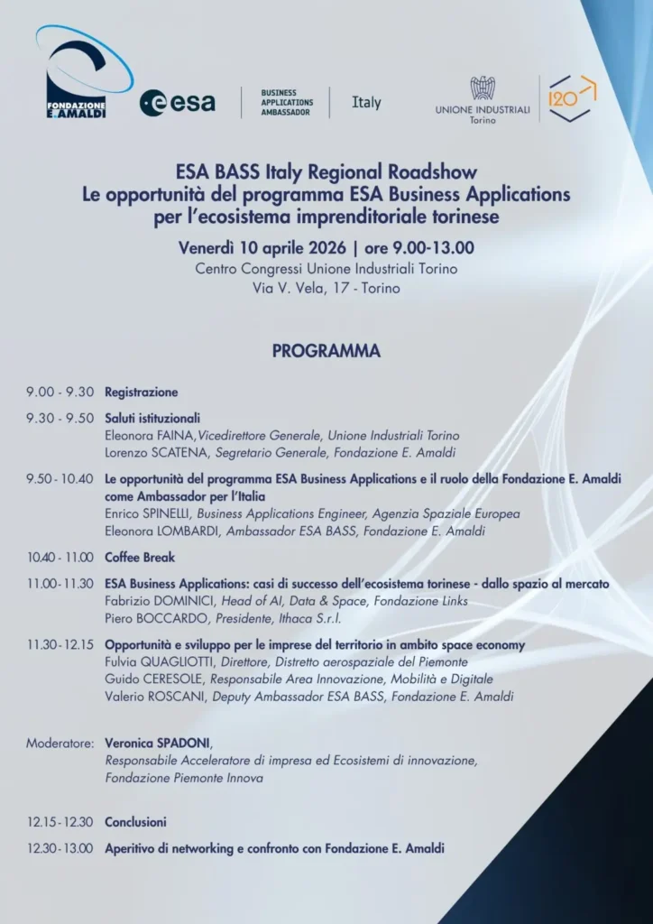 Giovedì 10 aprile 2026, dalle 9.00 alle 13.00Unione Industriali Torino promuove e ospita la prima tappa 2026 dell’ESA BASS Italy Regional Roadshow, presso il Centro Congressi di Unione Industriali Torino.