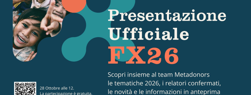 Il 28 ottobre alle ore 12:00 si terrà la presentazione ufficiale della nuova edizione di FX26, l’evento promosso da Metadonors dedicato a chi lavora nel mondo del fundraising e dell’innovazione sociale.